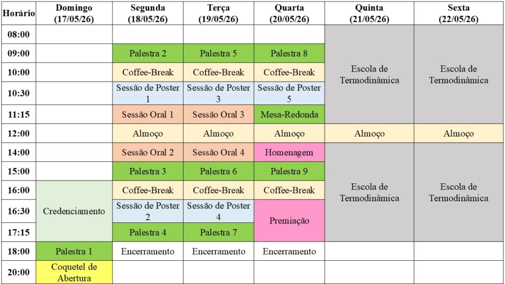O XIII CBTermo terá uma programação rica e diversificada, incluindo 9 palestras, 4 sessões orais e 5 sessões de pôster. Além disso, haverá a premiação dos melhores trabalhos apresentados, a concessão de prêmio para um pós-graduando com trajetória científica de destaque na área de termodinâmica e uma homenagem a um pesquisador com carreira consolidada na área.