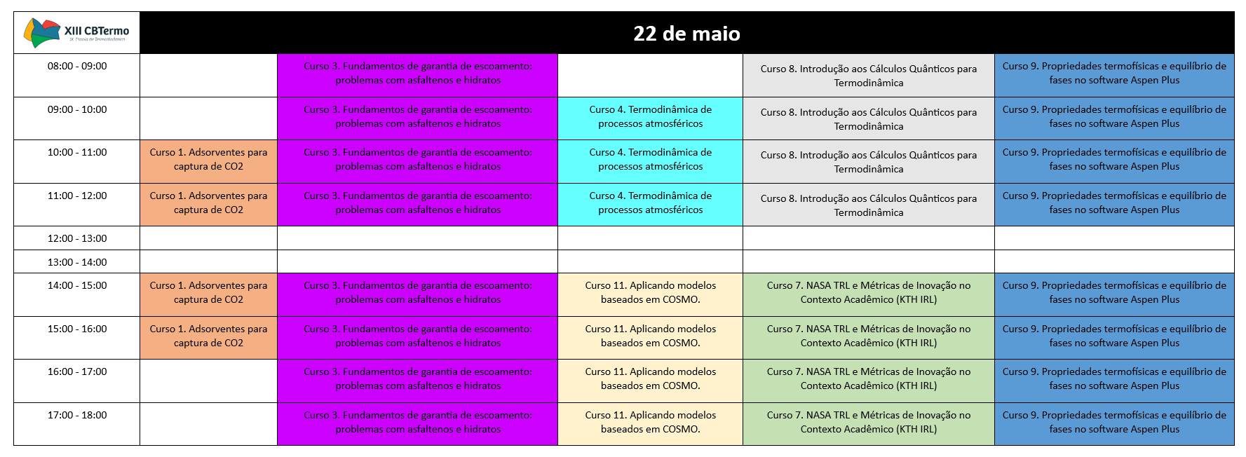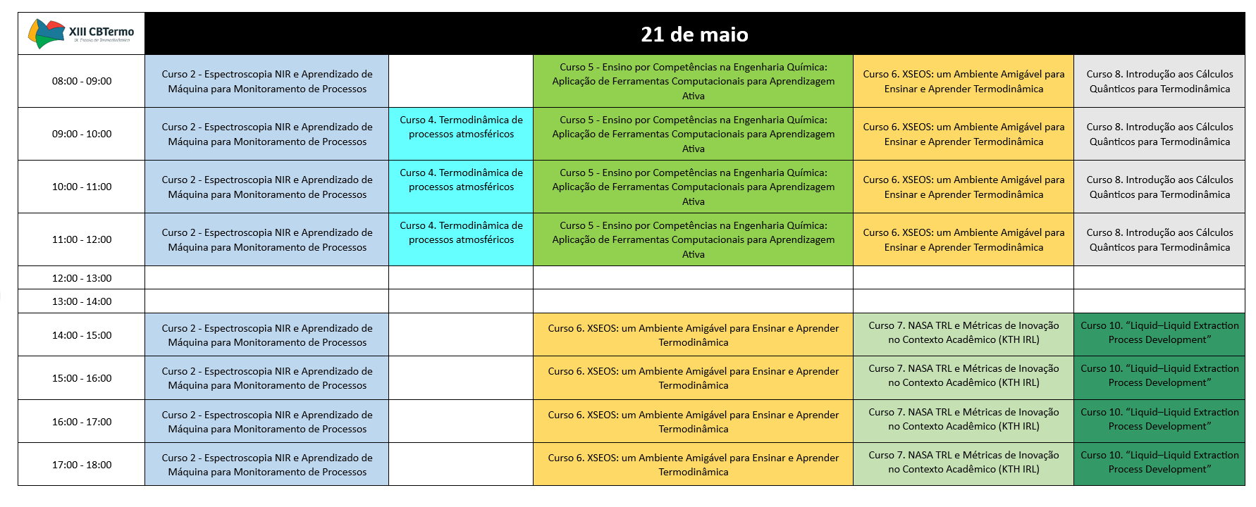 Cronograma da Escola de Termodinâmica que acontecerá nos dias 21 e 22 de maio de 2026.